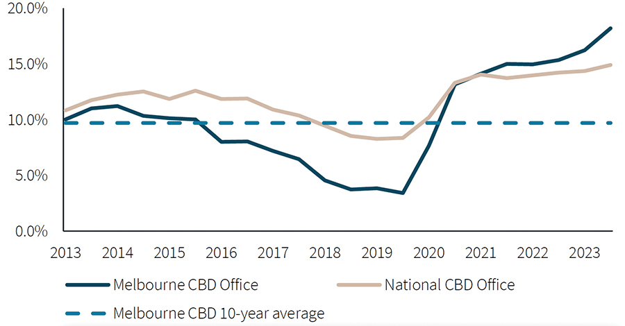 On the other hand, the CBD office market is still working through structural changes. Vacancy is negatively impacted by the Docklands precinct (with a vacancy rate of 20.7%), which is characterised as the back-of-house offices of large multinational corporations. Given the solidification of hybrid working policies by many large occupiers and a notable office supply pipeline, it will likely take some time before the Melbourne CBD office vacancy rate trends materially lower.