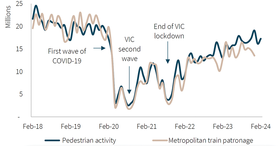 Since the trough of travel within the CBD in 2021, international arrivals into Victoria (1.86 million as of September 2023) have rebounded to 60% of 2019 levels (3.13 million). In the 12 months to December 2023, CBD pedestrian activity has rebounded to 84% of 2019 levels. The influx of international travellers and students, as well as the implementation of return-to-office mandates, likely drove a further recovery in foot traffic.