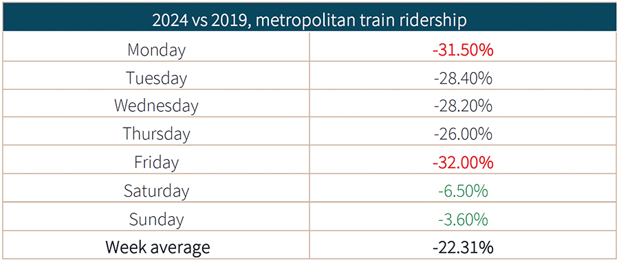 - Figure 4: 2024 vs 2019, metropolitan train ridership